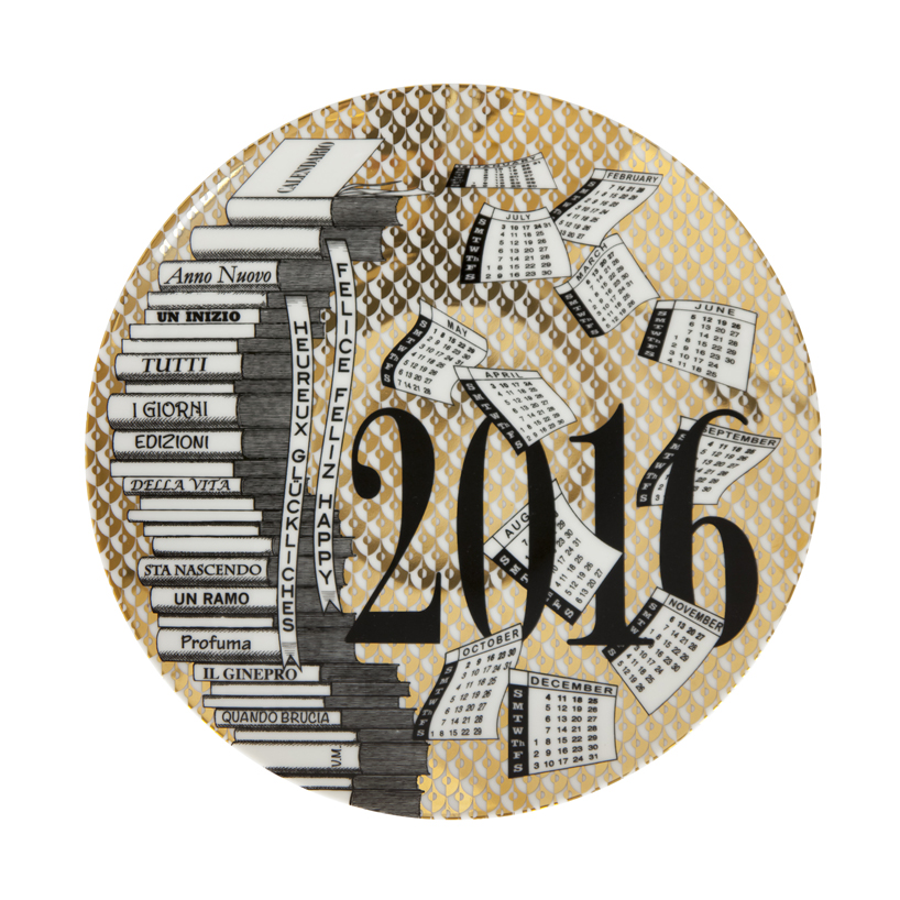 Come ogni anno il piatto calendario di Fornasetti è un must da non perdersi. Questa tradizione è stata portata avanti da Barnaba Fornasetti e la sua origine risale già agli anni quaranta quando Giò Ponti aveva commissionato a Piero Fornasetti un libro soprammobile, da regalare ad amici e clienti come buon auspicio per il nuovo anno. Questi non erano altro che libretti stampati a mano e Fornasetti decise di sostituirli con dei piatti calendario. Ogni anno i giorni e i mesi sono decorati con una grafica e decori tipici dell’immaginario di Fornasetti come soli, lune, carte da gioco, gatti, segni zodiacali…